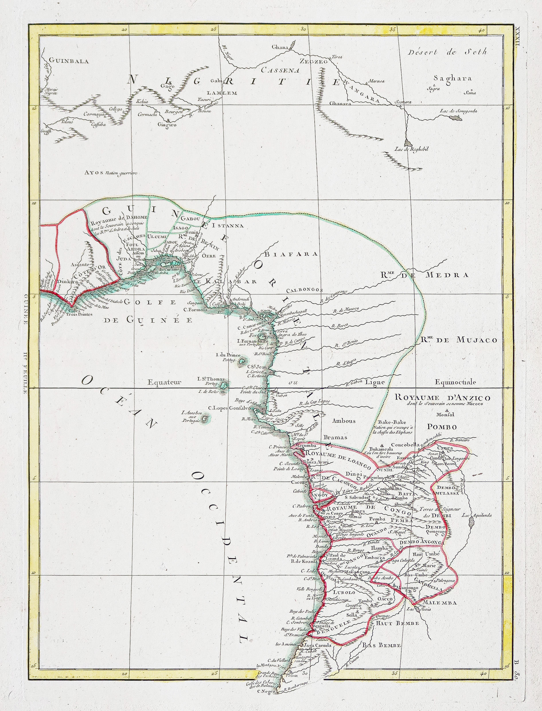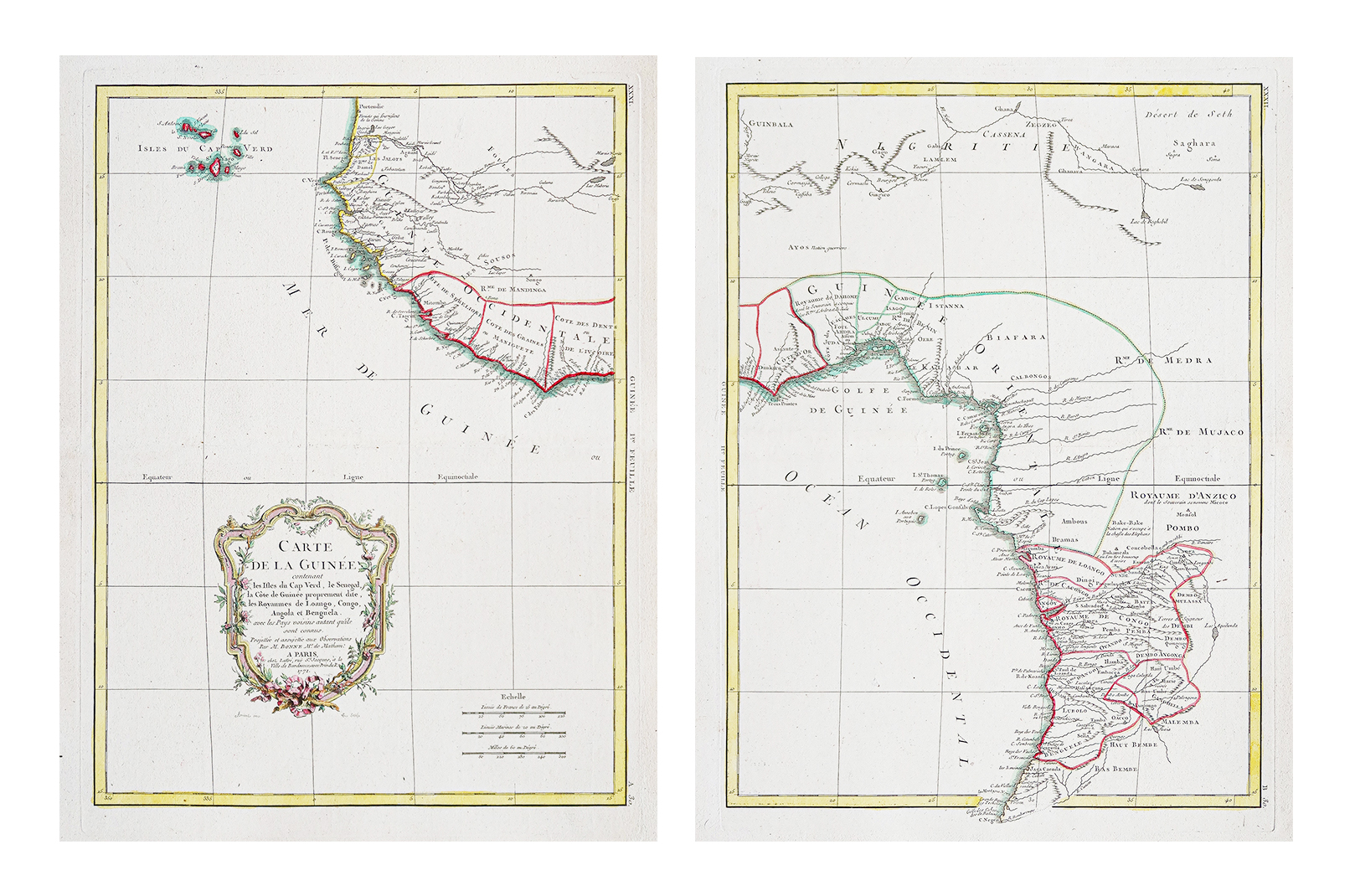 Echelle des lieux. Large cartouche illustré. Carte de la Guinée contenant les îles du cap vert, le Sénégal, la côte de Guinée proprement dite, les royaumes de Loango, Congo, Angola et Benguela. 2 feuillets à joindre sur demande pour cette très belle carte de la Guinée.