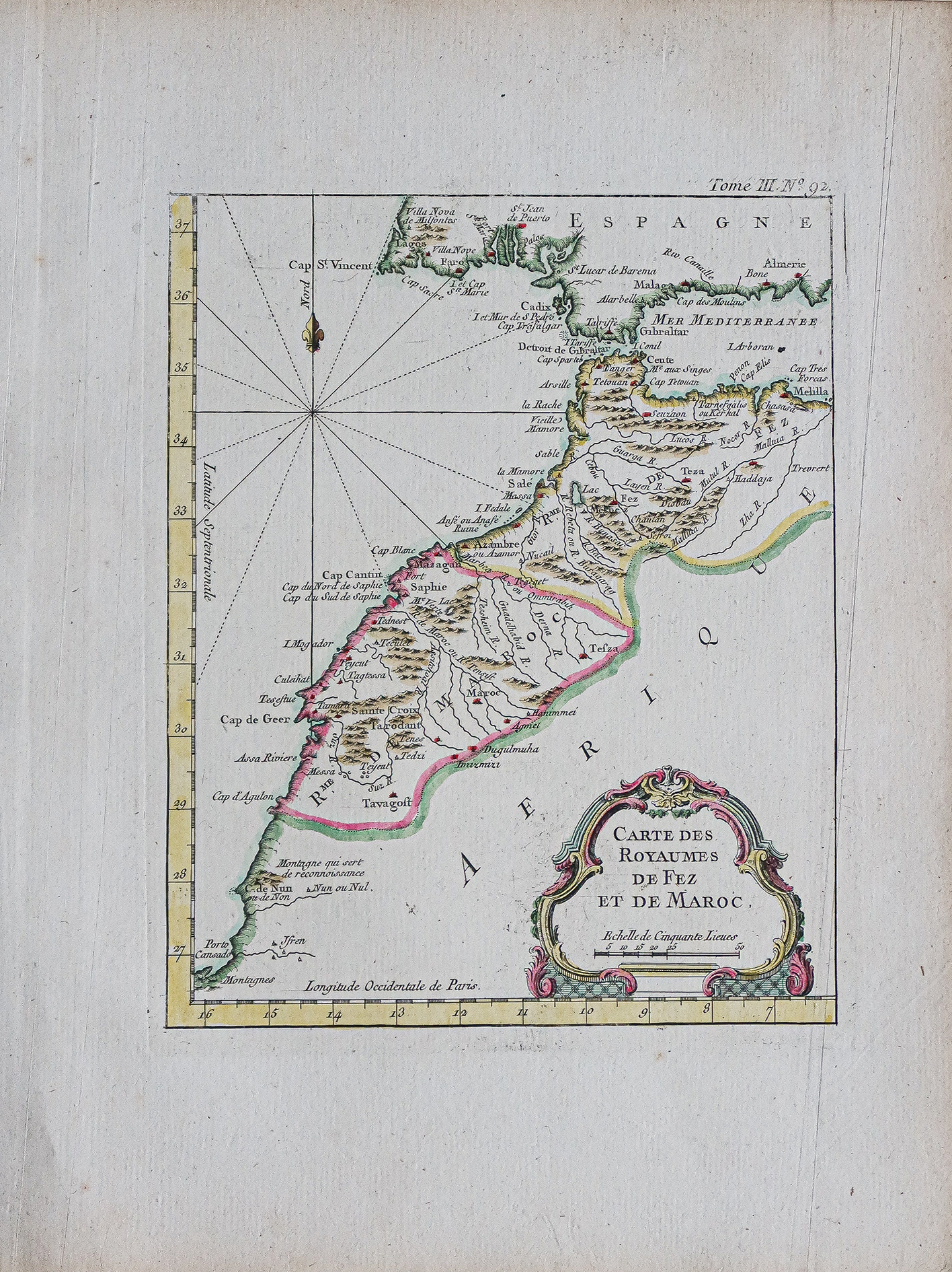 Epreuve originale réalisée en 1780. Bonne cartographe. Coloris aquarelle. Mouillure claire dans la marge latérale droite. Bon état. Format feuille : 44 x 30,5 cm. Format gravure : 36 x 24,5 cm. Original antique map of 1780. Rigobert Bonne (1727-1795) est un ingénieur hydrographe et cartographe français du 18ème siècle. Né dans les Ardennes à Raucourt en 1727, il succède en 1775 à Giovanni Rizzi-Zannoni comme cartographe du Roi de France au Service Hydrographique de la Marine (le Dépôt des cartes et plans de la Marine est créé sur ordre du Roi Louis XV en 1720). Vers 1780, il définit précisément la projection qui portera alors son nom : la Projection de Bonne. Il meurt à Paris en 1795, son fils Charles-Marie Rigobert dit le Chevalier Bonne (25 juin 1771 - 23 novembre 1839), poursuivra son œuvre.