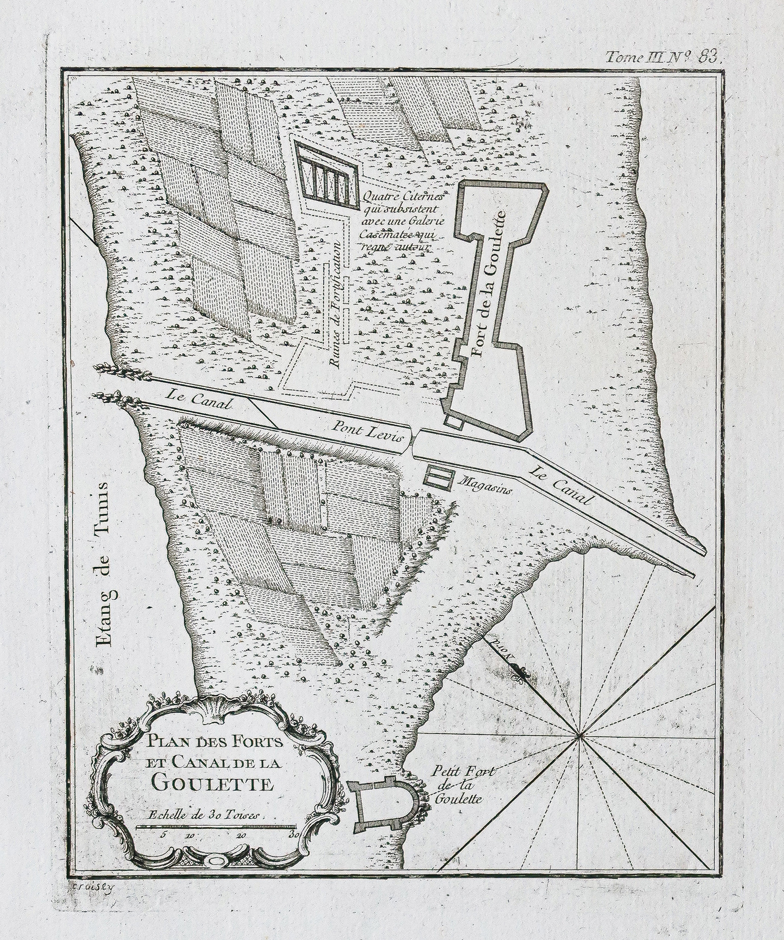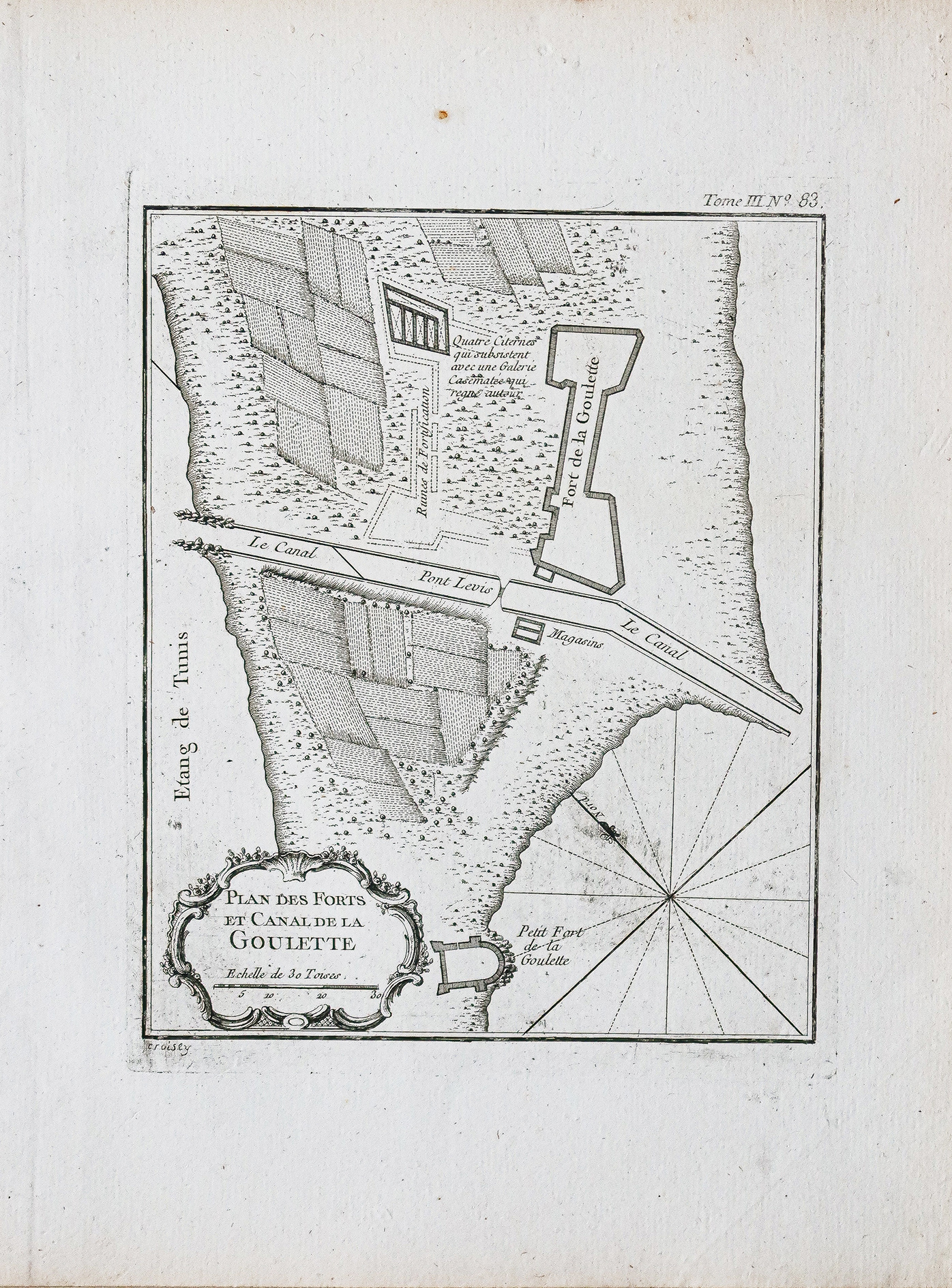 Epreuve originale réalisée vers 1750. Bellin cartographe. Rousseurs dans la marge latérale droite au niveau du liseré. Bon état. Format feuille : 34 x 26 cm. Format gravure : 23 x 18,5 cm. Original antique plan around 1750. Boussole. Echelle des lieux. Ghar El Melh, signifiant « grotte du sel » et anciennement appelé Porto Farina, est une ville côtière du nord-est de la Tunisie. Ce plan détaillé comprend les sondages, les points de mouillage et les dangers pour la navigation, fournissant des informations essentielles à la navigation maritime du XVIIIe siècle.