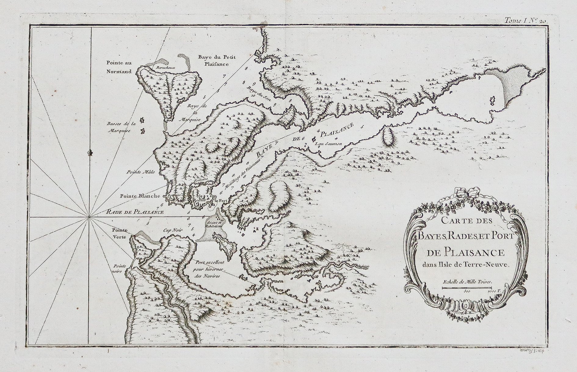 Cartouche de titre décoratif. Echelle des lieux. Boussole. Carte des baies Rades et Port de Plaisance dans l’île de Terre-Neuve.