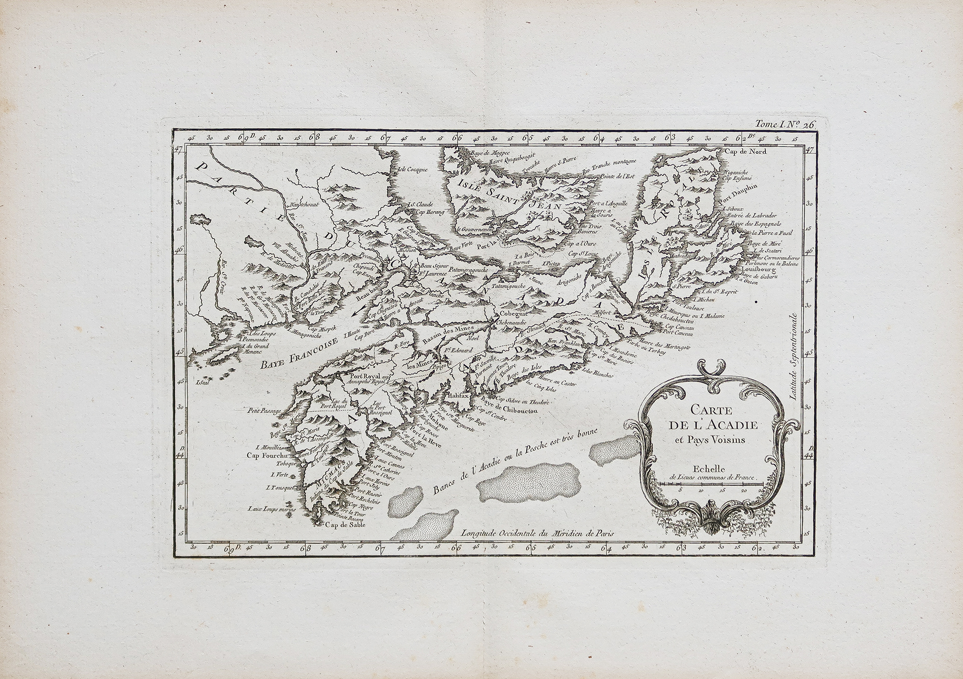 Echelle des lieux. Carte détaillée de l’Acadie, de l’île Saint-Jean et de la région s’étendant jusqu’au fleuve Saint-Jean dans le nord-est du Canada, par Nicolas Bellin, hydrographe du roi de France.
