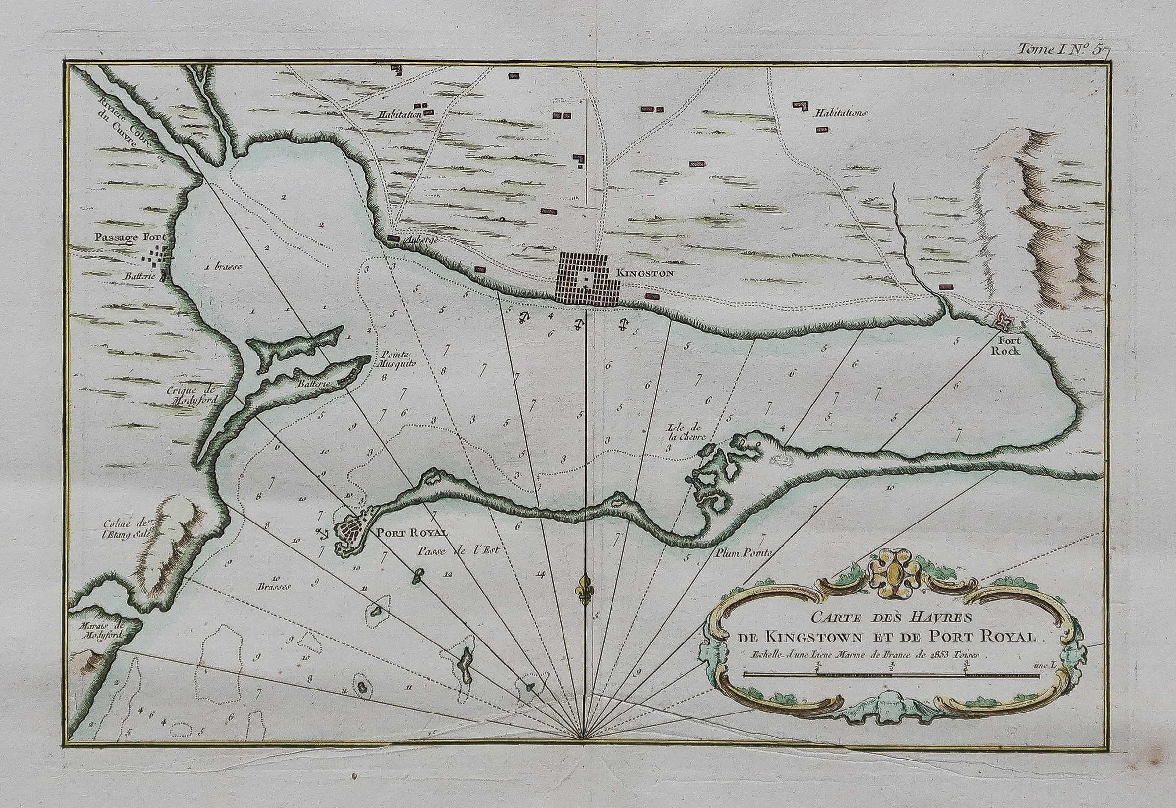 Port et fort Royal de la Grenade. Epreuve originale réalisée en 1764. Bellin cartographe. Coloris aquarelle. Rousseurs claires dans les marges n’atteignant pas la carte. Bon état. Format feuille : 34 x 25,5 cm. Format gravure : 23 x 18 cm. Original antique map of 1764. Fleur de lys indiquant le Nord.