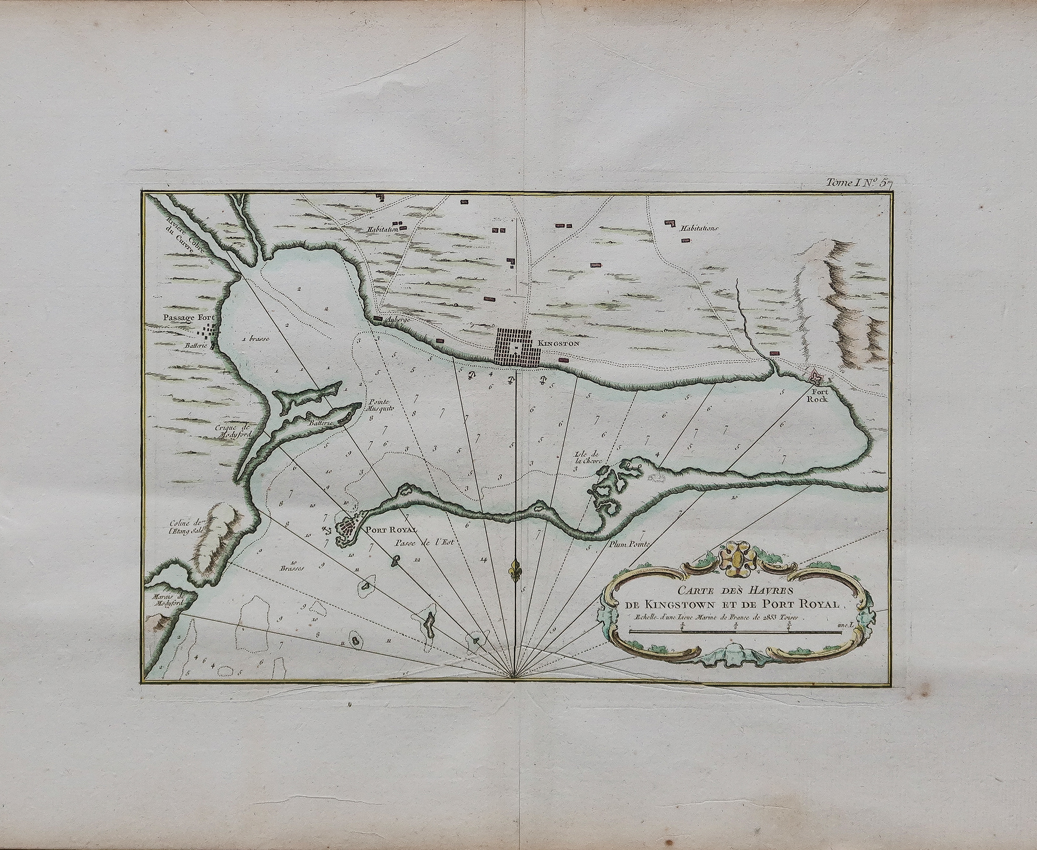 Environs du Fort St. Louis. Epreuve originale réalisée en 1764. Bellin cartographe. Coloris aquarelle. Très bon état. Format feuille : 34 x 25 cm. Format gravure : 23,5 x 18,5 cm. Original antique map of 1764. Carte particulièrement précise avec relevés des fonds marins, cartouche de titre aquarellé. Repère indiquant le nord.