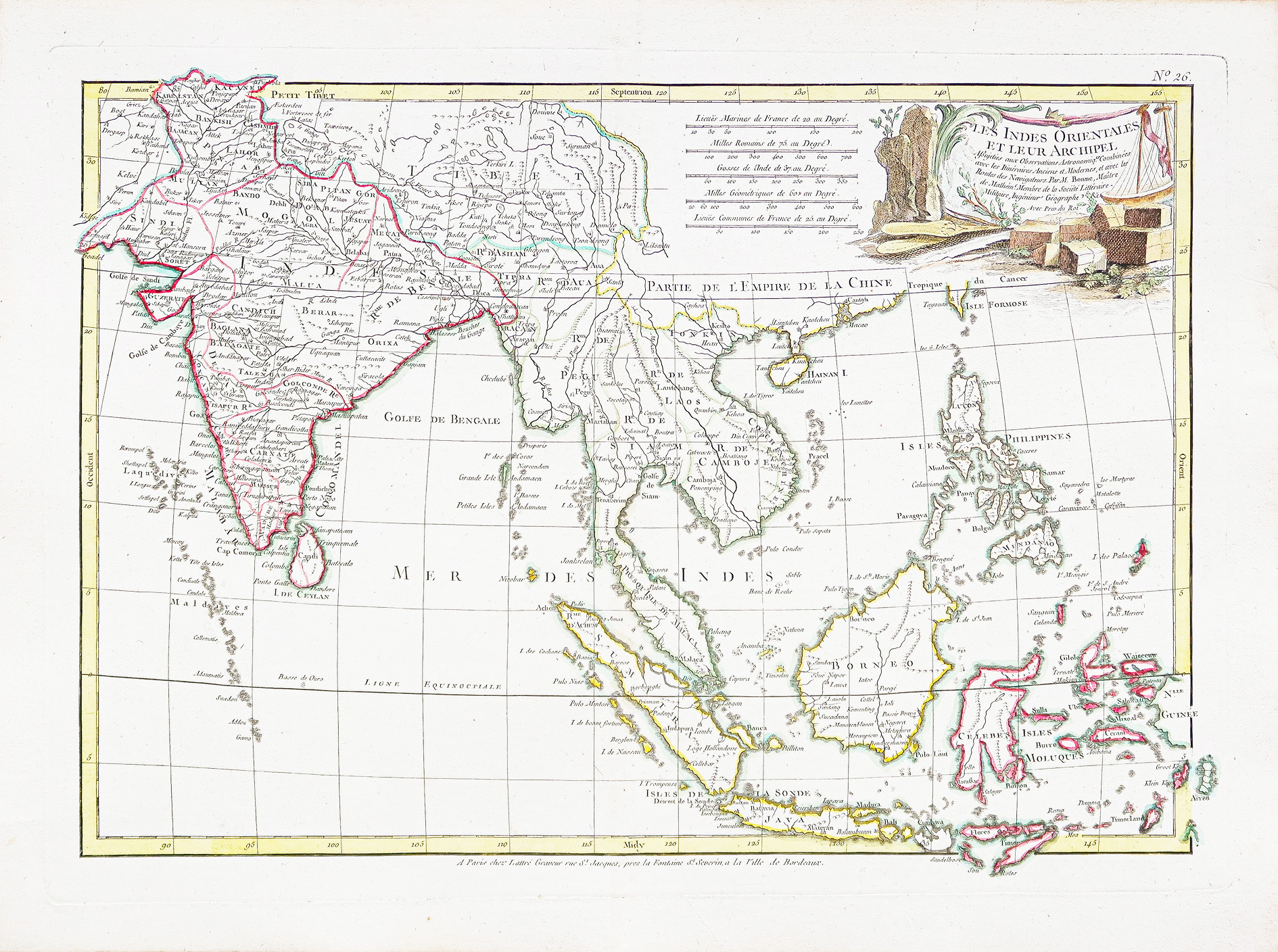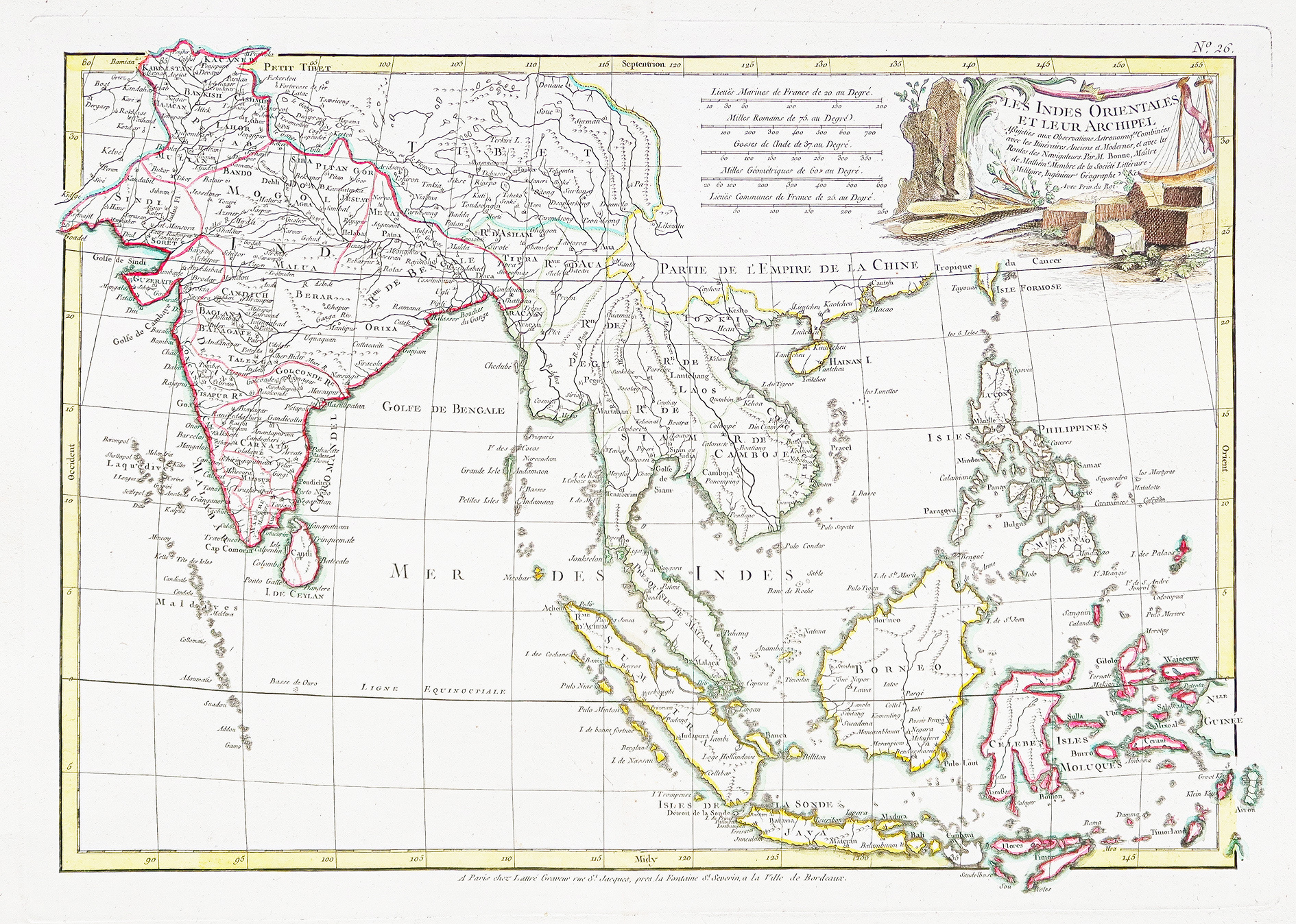 Echelle des lieux. Cartouche de titre décoratif. « Les Indes Orientales et leur Archipel, assujetties aux observations astronomiques combinées avec les itinéraires anciens et modernes, et avec les routes des navigateurs».