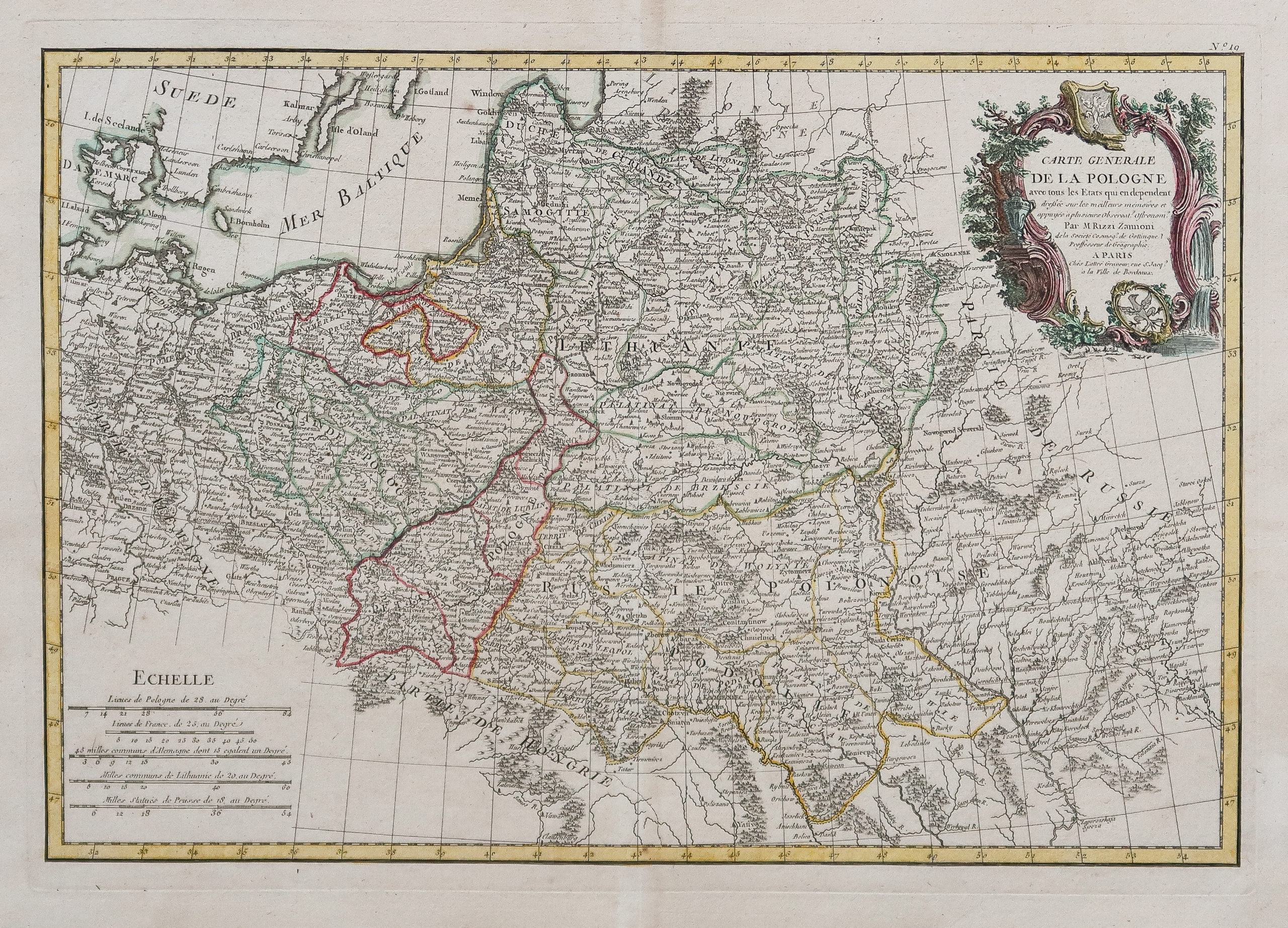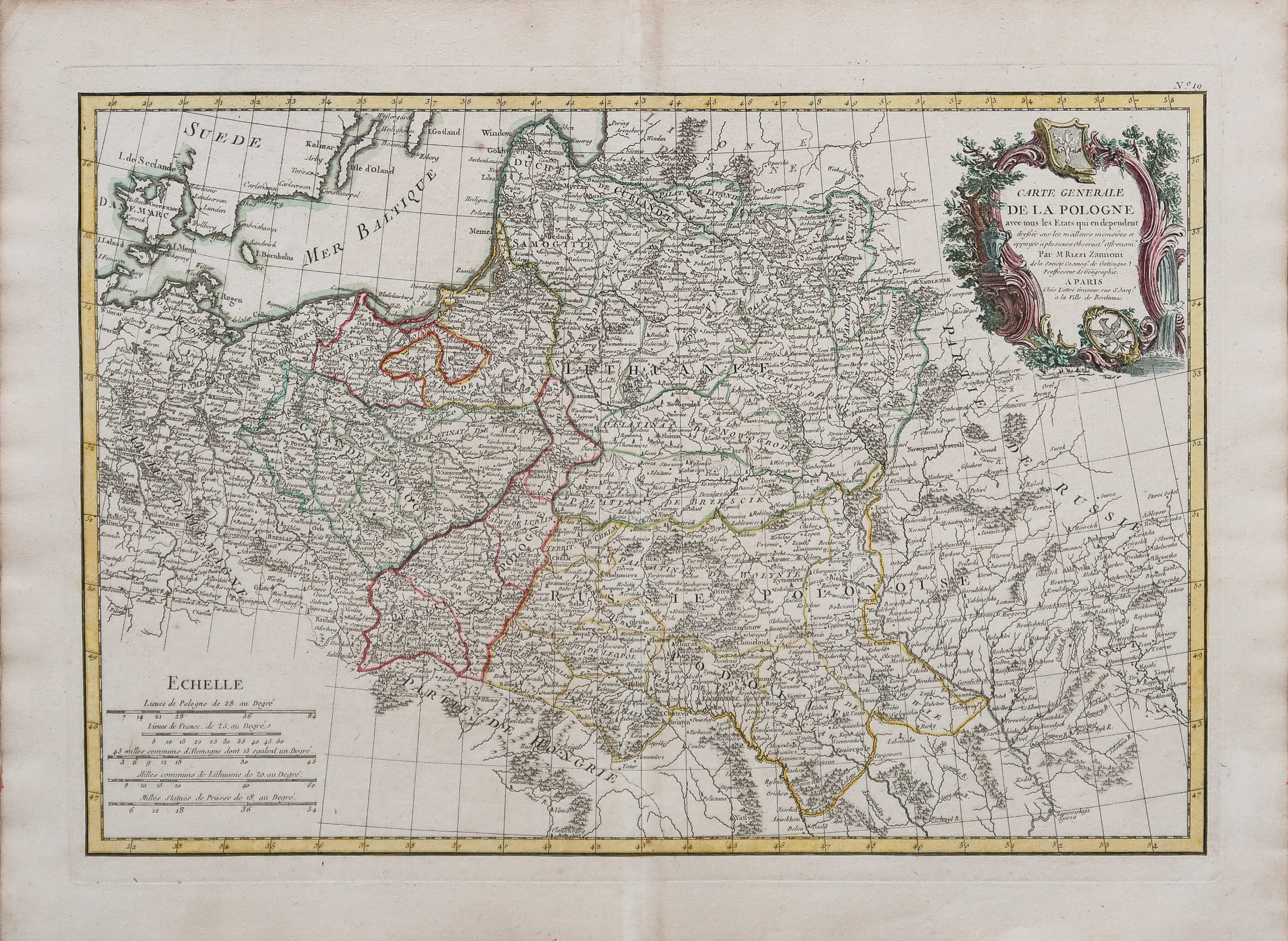 Epreuve originale réalisée en 1751. Robert de Vaugondy géographes, père et fils. Limites colorées de l’époque. 1 rousseur dans la marge latérale droite près du cuivre. Bon état. Format feuille : 75 x 56 cm. Format gravure : 49,5 x 50,5 cm. Original antique map of 1751. Le cercle de Bavière qui comprend le Haut Palatinat, les Duchés de haute et basse Bavière et de Neuburg, l’Archevêché de Salzburg, les Evêchés de Ratisbonne, de Freisingen, de Passau et la Prévôté de Berchtolsgaden. Excellente carte du géographe Robert de Vaugondy en première édition. Echelle des mesures, cartouche de titre aquarellé.