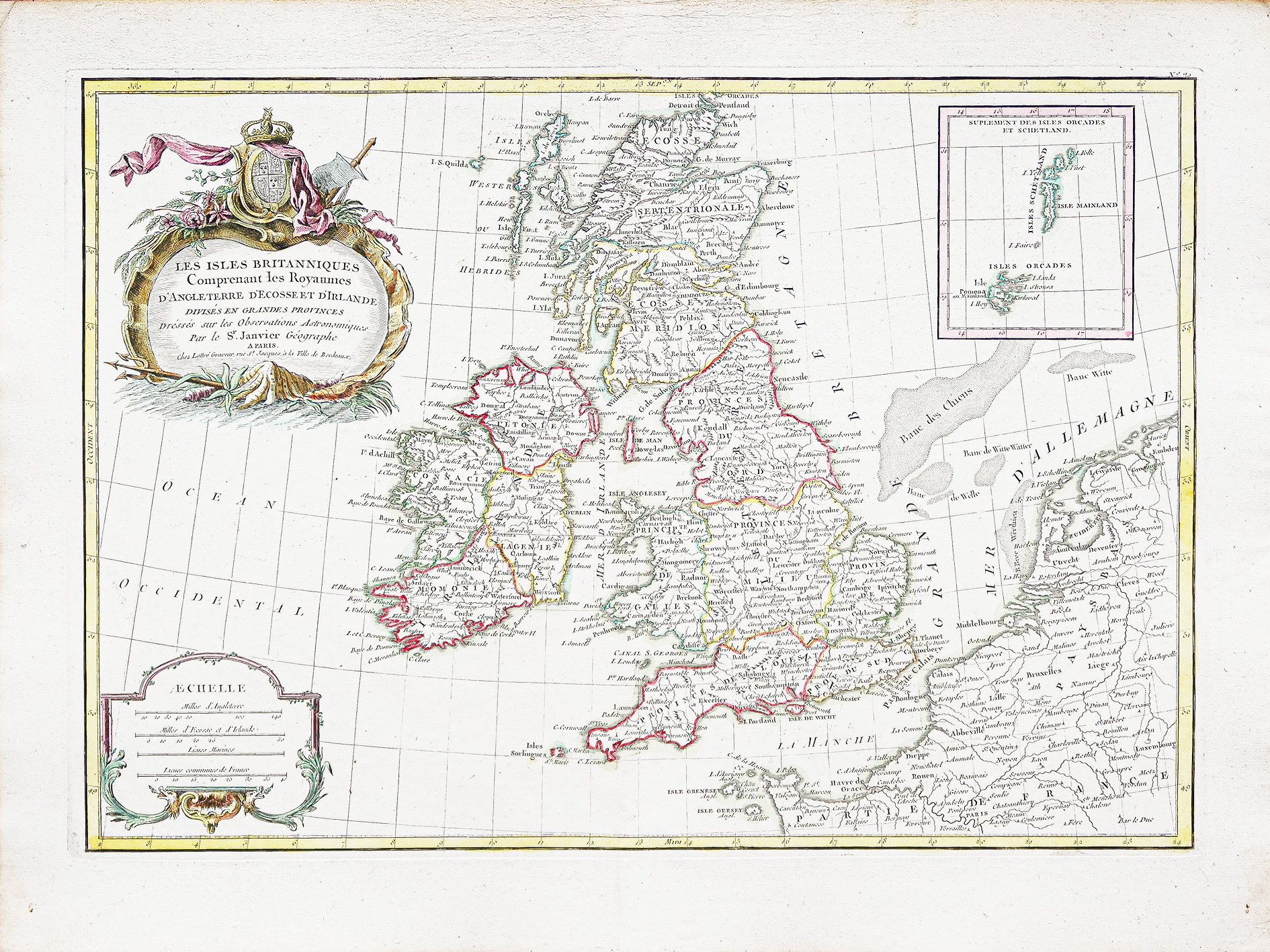 Epreuve originale réalisée en 1750. Robert de Vaugondy géographes, père et fils. Limites colorées de l’époque. Très bon état. Format feuille : 75 x 56 cm. Format gravure : 62 x 49,5 cm. Original antique map of 1750. Royaume d’Irlande divisé en ses 4 provinces et subdivisés en comtés. Excellente carte du géographe Robert de Vaugondy en première édition. Echelle des mesures, cartouche de titre aquarellé.