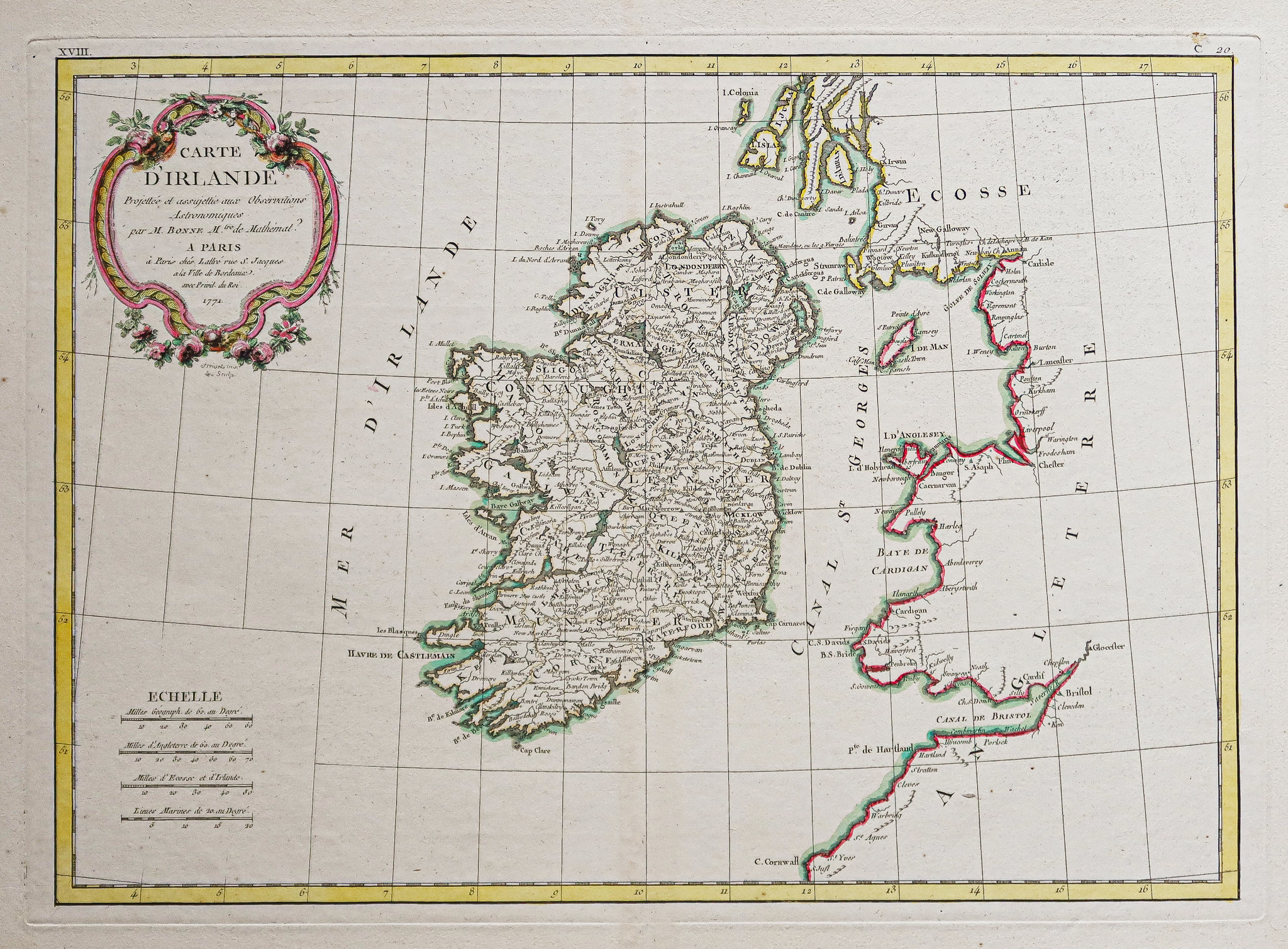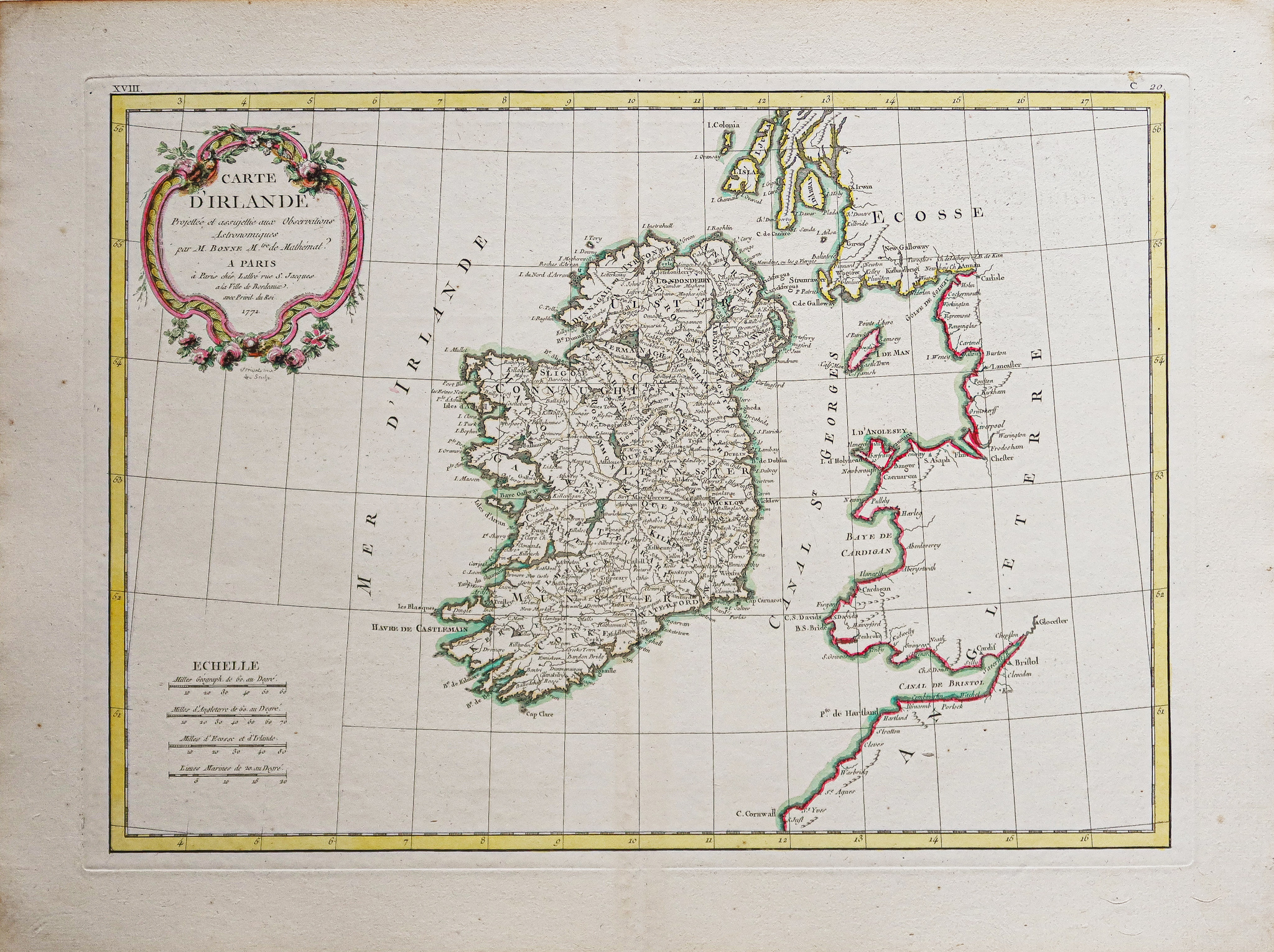 Epreuve originale réalisée en 1754. Robert de Vaugondy géographe. Limites colorées de l’époque. Très bon état. Format feuille : 73 x 55,5 cm. Format gravure : 61,5 x 59,5 cm. Original antique map of 1754. Encart illustrant les Îles Orcades, Shetland et Féroé. Excellente carte du géographe Robert de Vaugondy en première édition. Echelle des mesures, cartouche de titre aquarellé.