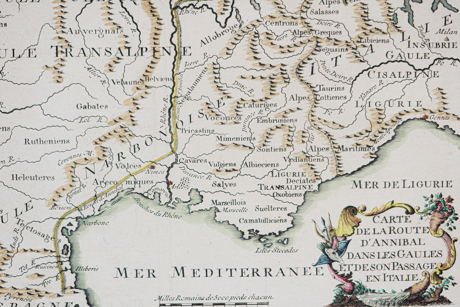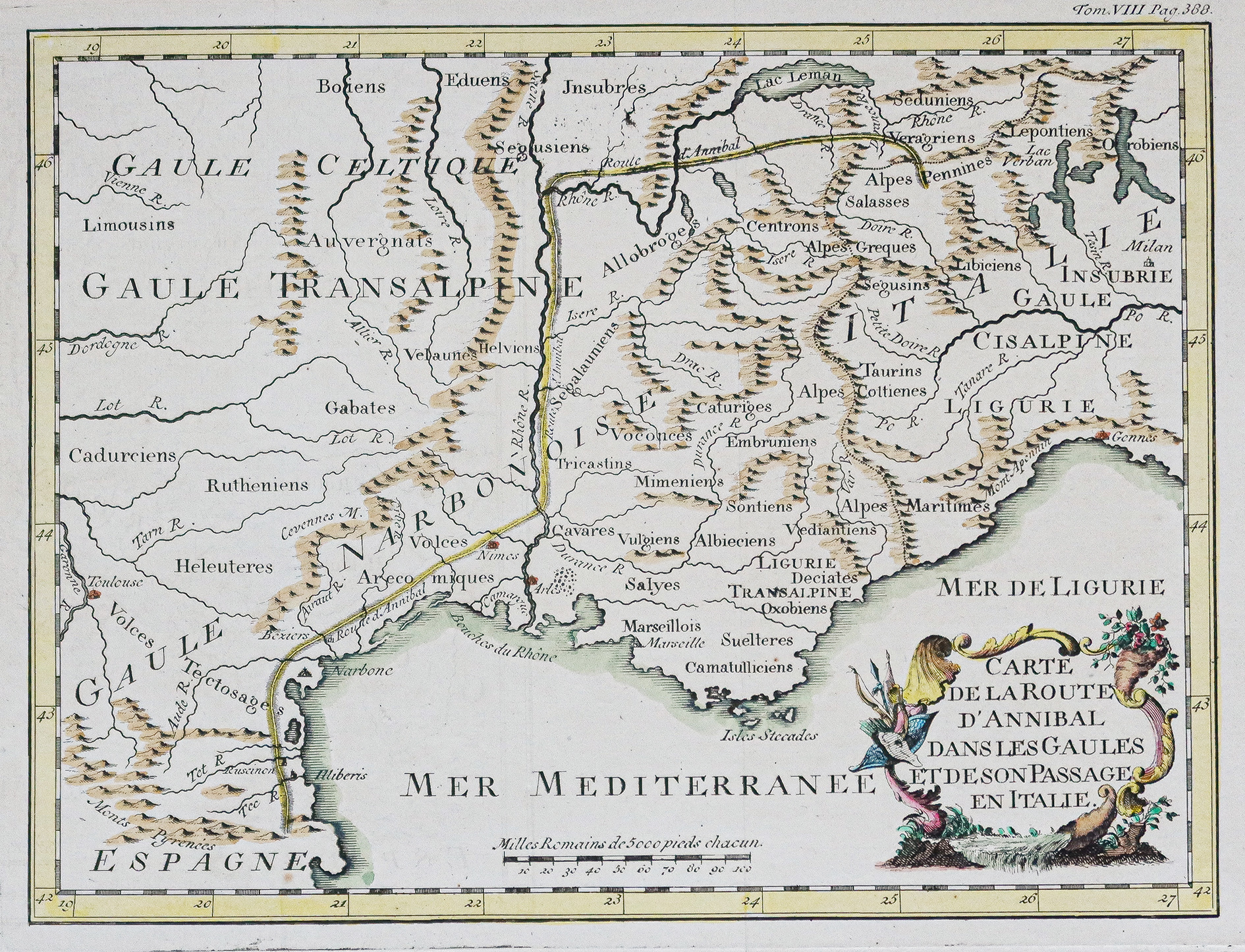 Echelle des lieux. Cartouche de titre illustré. Carte de la route d’Annibal dans les Gaules et de son passage en Italie. Le passage des Alpes par Hannibal est une étape majeure de la marche vers l’Italie de l’armée d’Hannibal Barca, réalisée à la fin de l’année 218 av J-C, au début de la deuxième guerre punique déclenchée contre Rome. Ce périple précis s’étala sur quinze jours, pour approximativement deux cents kilomètres parcourus.