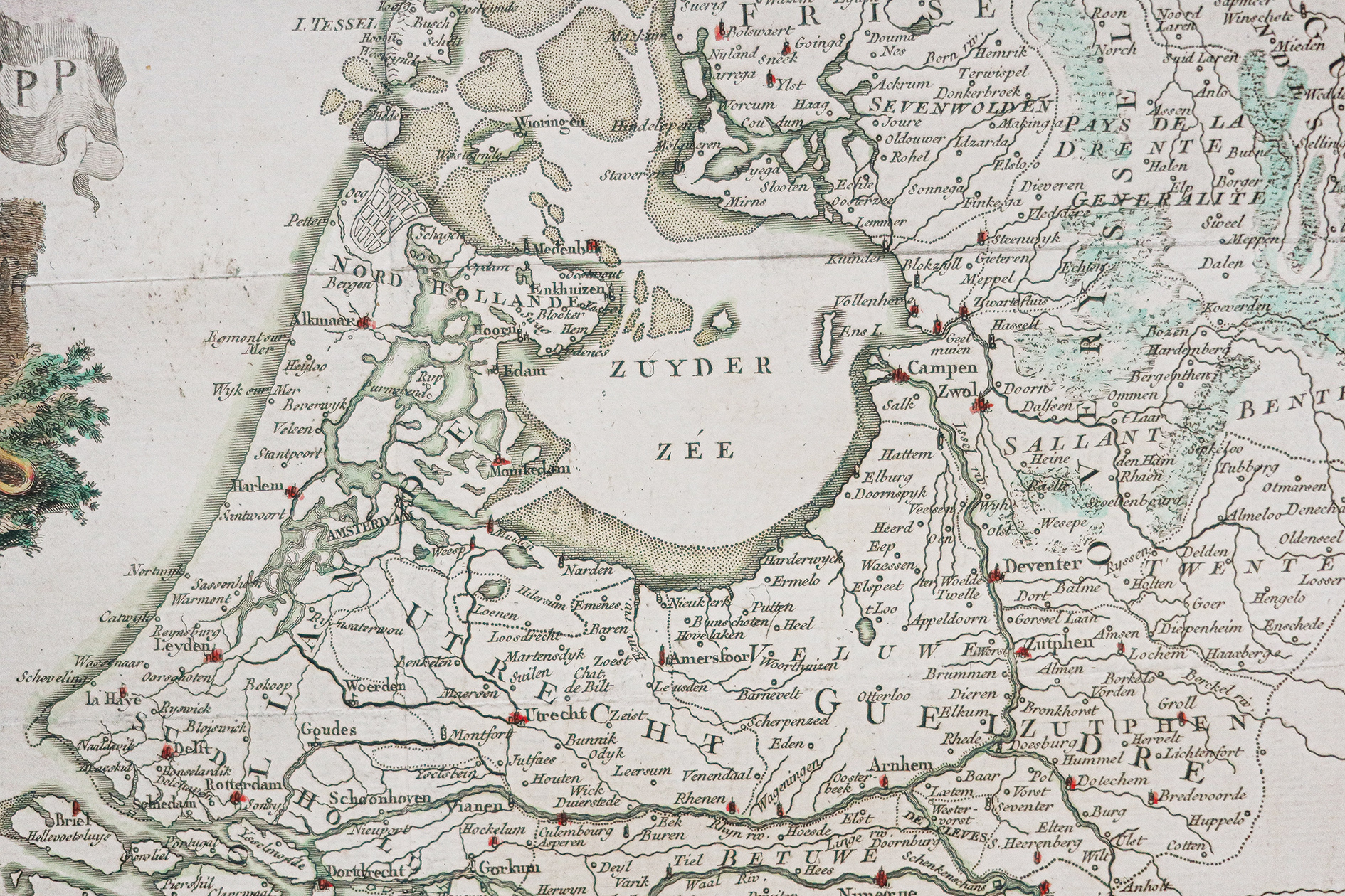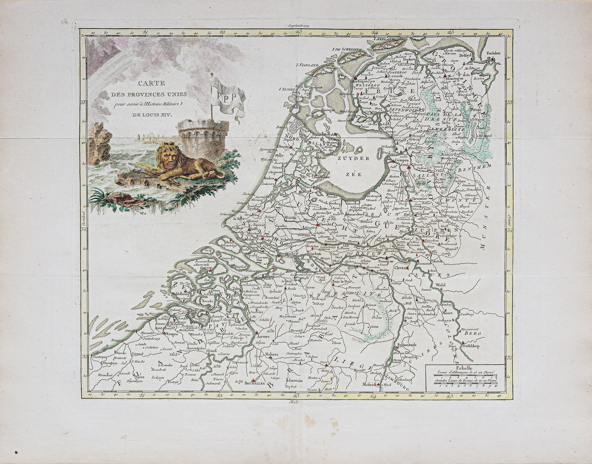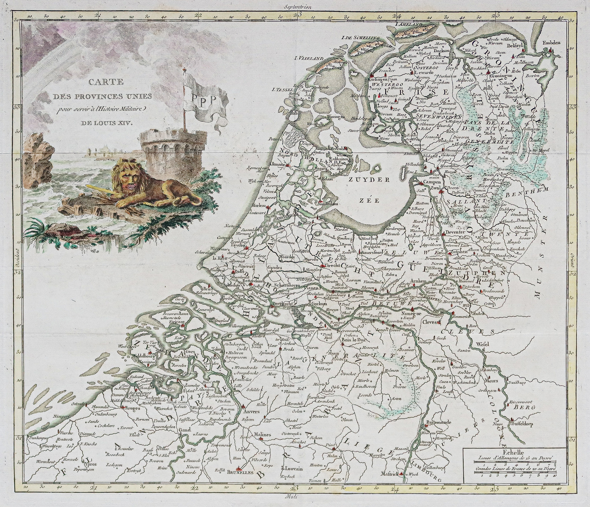 Carte des provinces unies pour servir à l’Histoire militaire de Louis XIV. Echelle des lieux. Large cartouche de titre illustré.