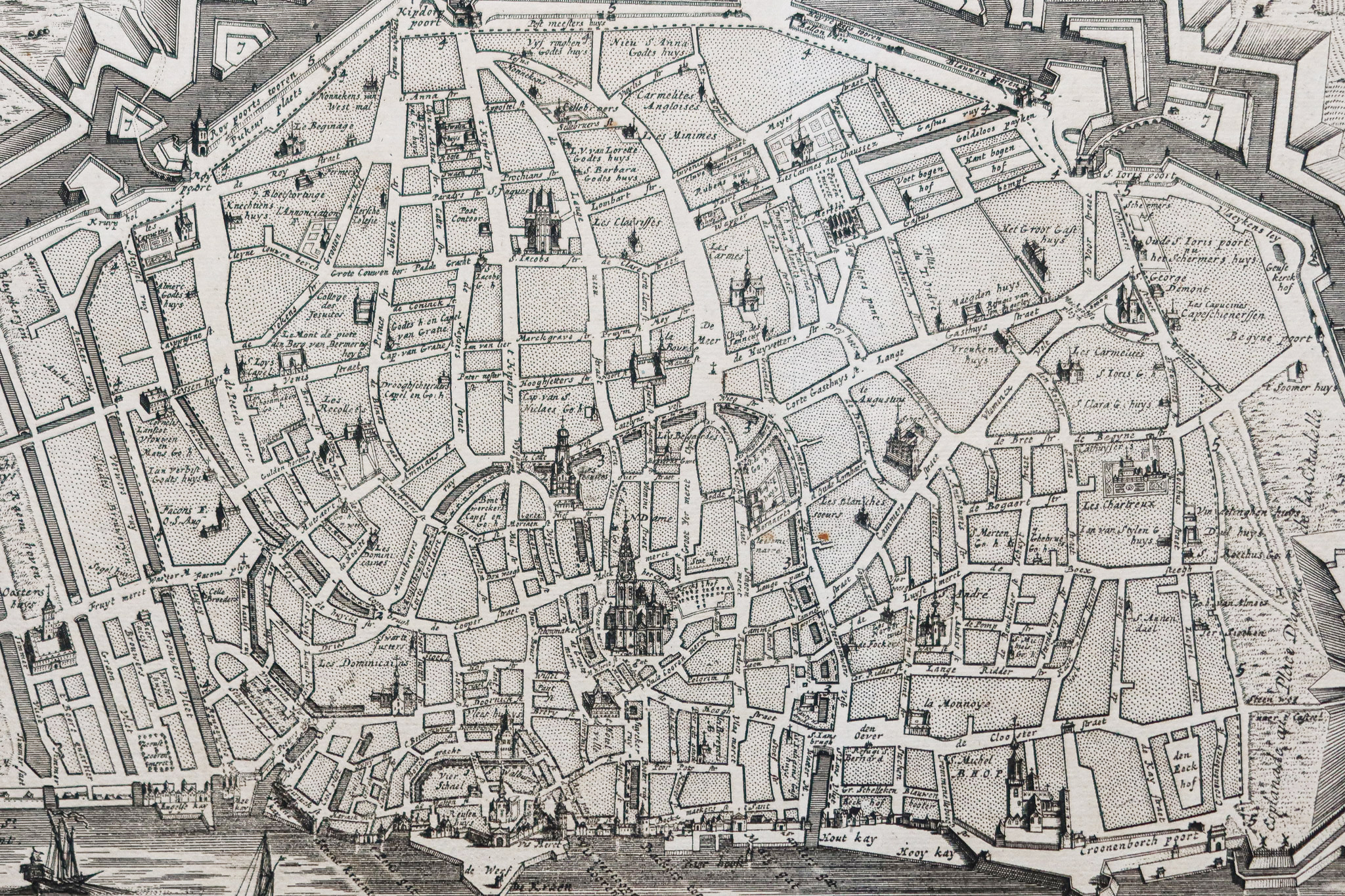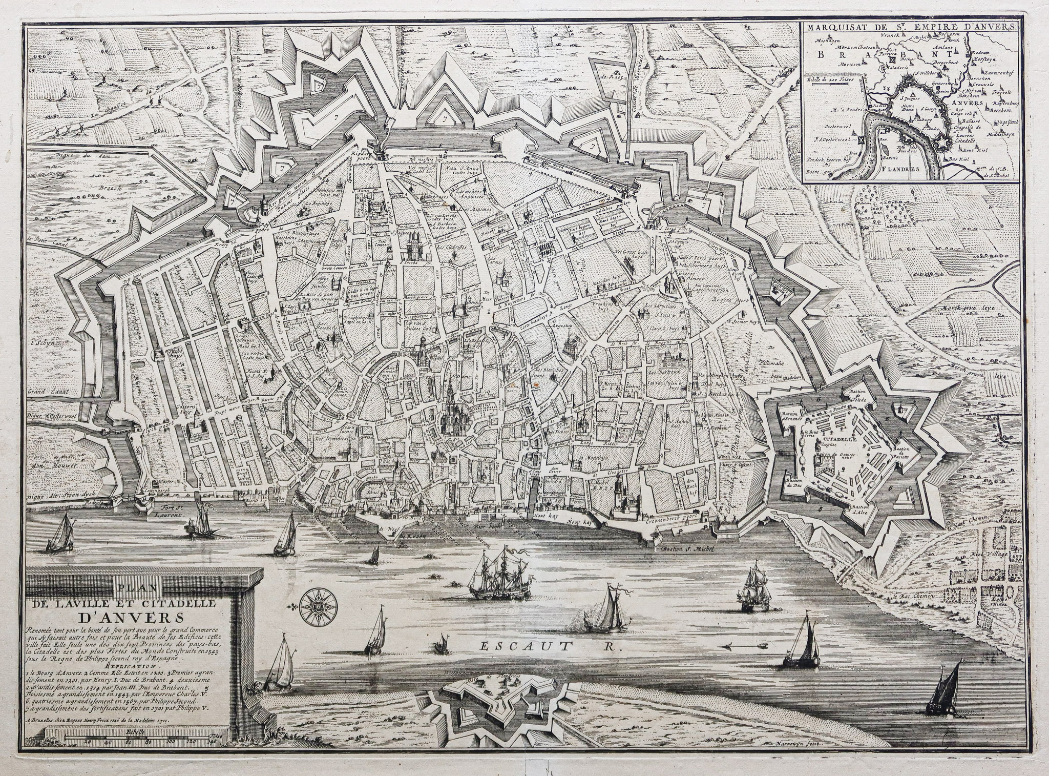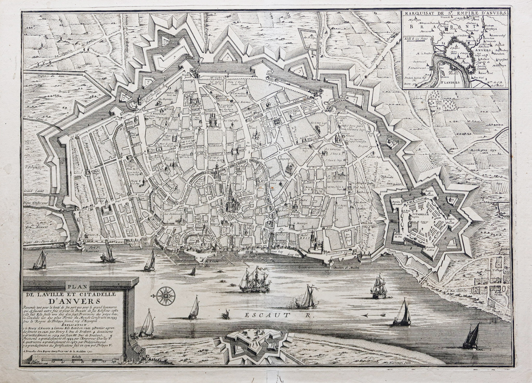 Belle épreuve illustrant la ville et la citadelle d’Anvers. 1 cartouche de titre avec explicatif et renvois de 1 à 7 situant les principaux lieux et bourgs de la ville. Cartouche du Marquisat de St Empire d’Anvers. Rose des vents et galions.