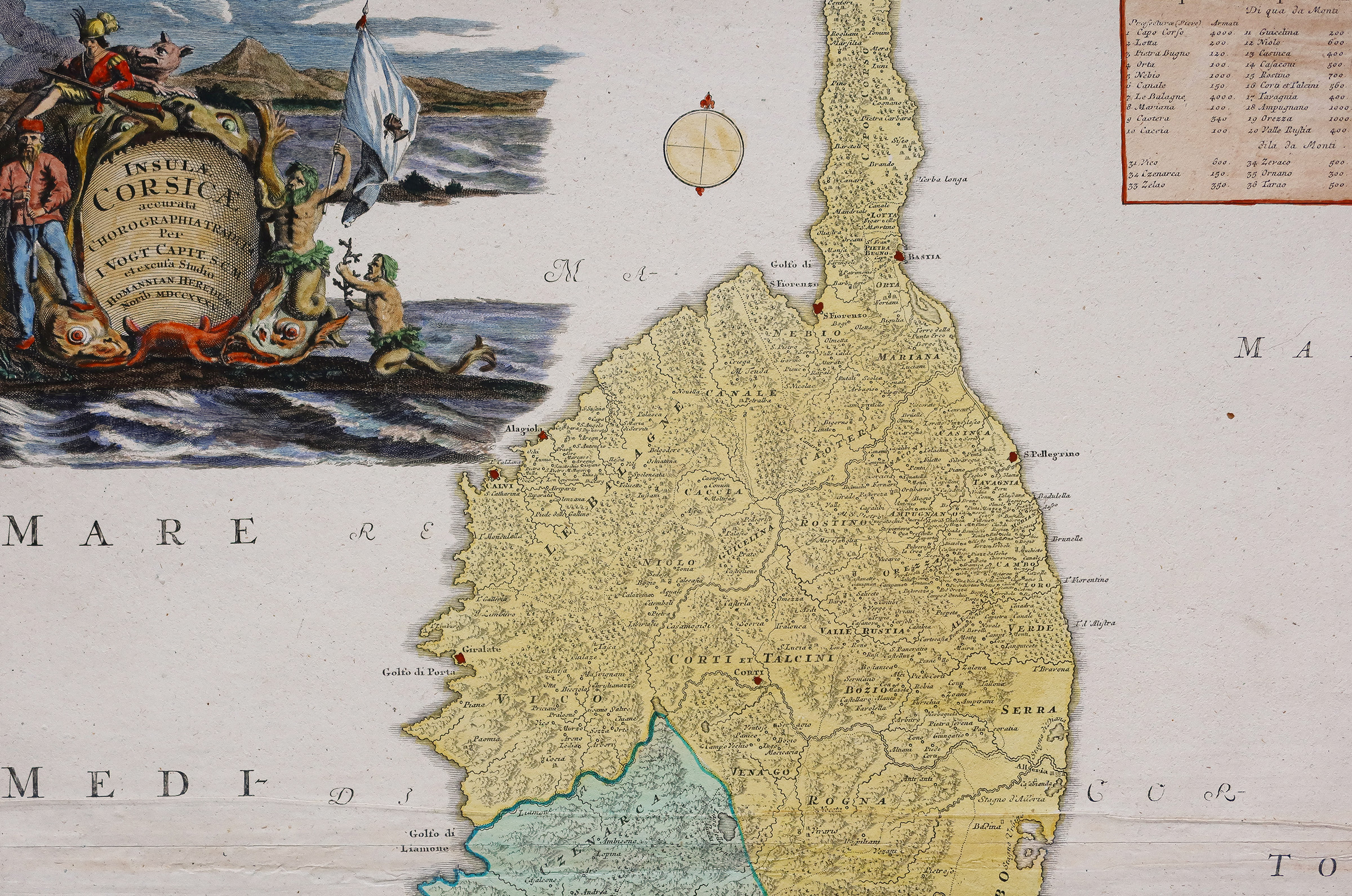 Epreuve originale réalisée en 1732. Homann héritier éditeur. Coloris anciens. Très bon état. Format feuille : 62,5 x 54 cm. Format gravure : 52 x 44 cm. Belle carte de l’Île de la Corse. Un large cartouche de titre et un plan de Bastia surmontent la carte. Galions décoratifs dans la mer. Johann Baptist Homann (1663-1724), protestant, fonde en 1702 sa propre maison d’édition de cartes et de gravures. Ses cartes feront de lui, l’un des cartographes allemands les plus renommés. En 1715, il est nommé Géographe Impérial par l’empereur Charles VI.