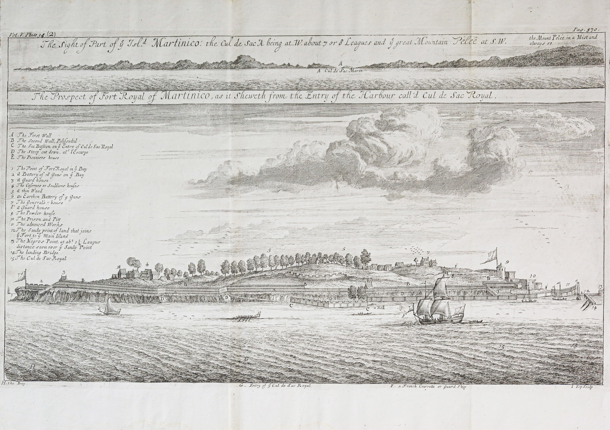 Panorama peu courant avec renvois de A à E et de 1 à 15 situant les principaux lieux et édifices de Fort Royal.