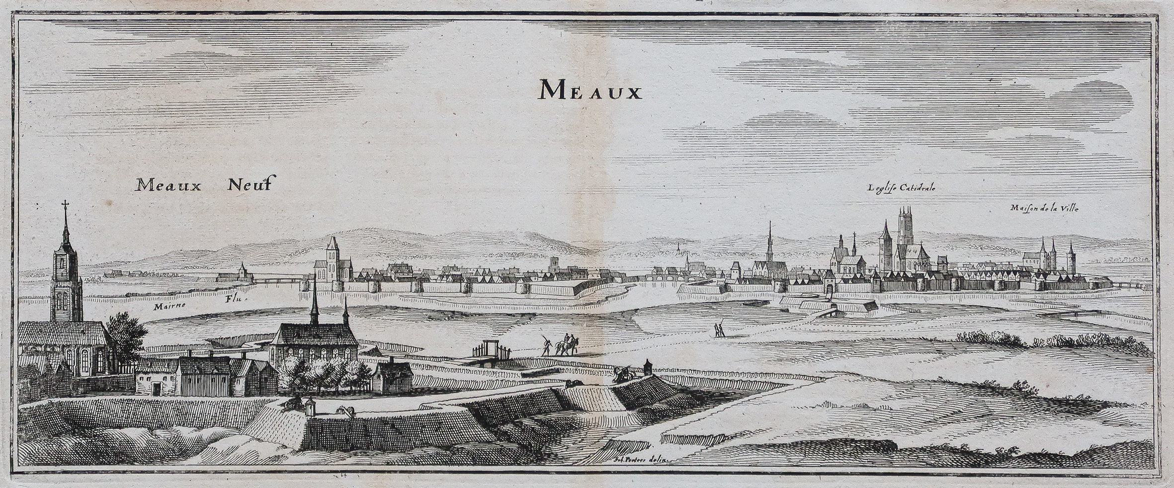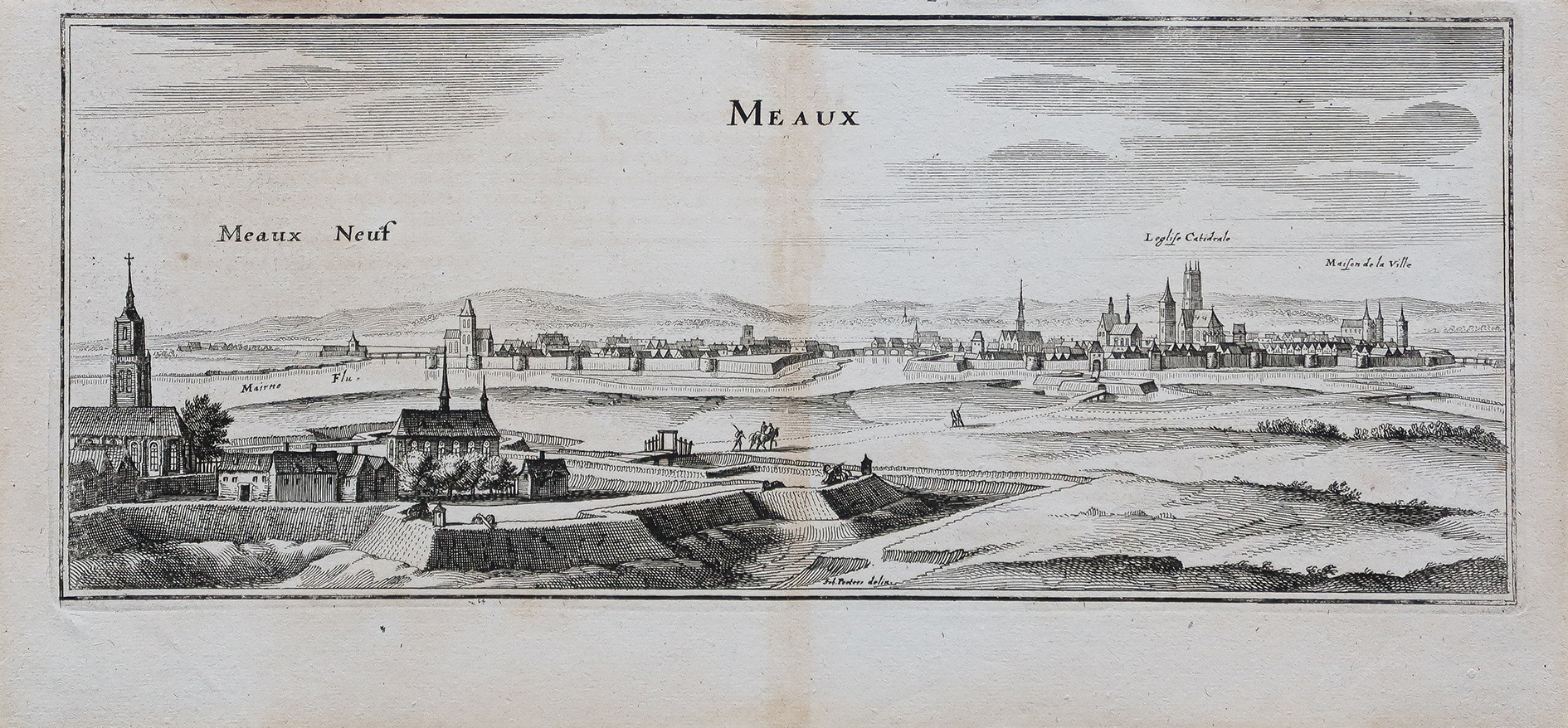 Belle impression bien contrastée pour cette représentation historique de la ville de Meaux. L’une des premières vues de la ville panoramique.