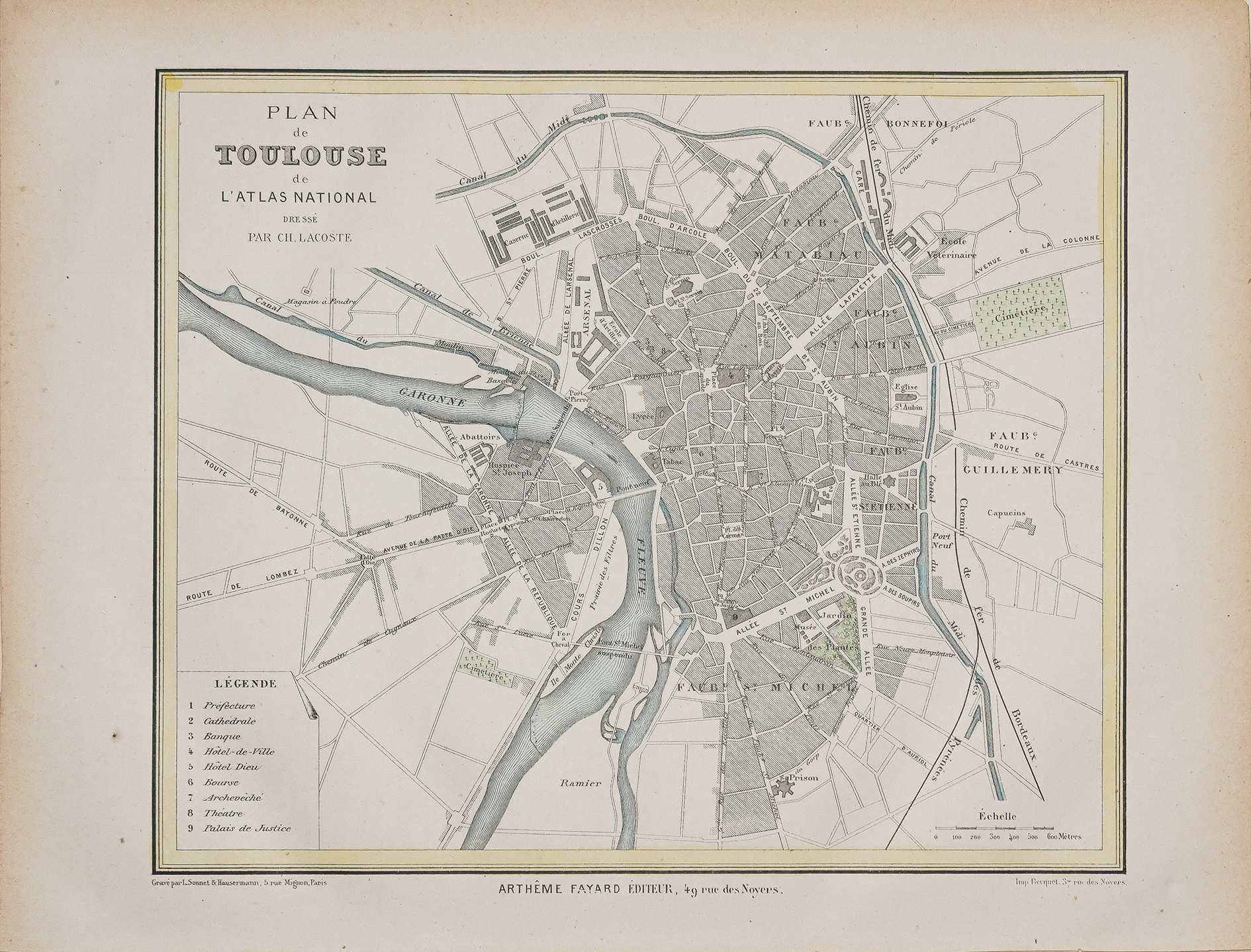 Carte originale gravée en 1880. Beaux cartouches colorés à l’aquarelle. Très bon état. Format feuille : 34,5 x 26,5 cm. Original antique map of 1880. Edition de la fin du 19ème siècle, gravée par Legénisel et Barbier, illustrant les départements français et d’Outre-mer, agrémentée de vignettes aquarellées du chef-lieu, curiosités et personnages célèbres.