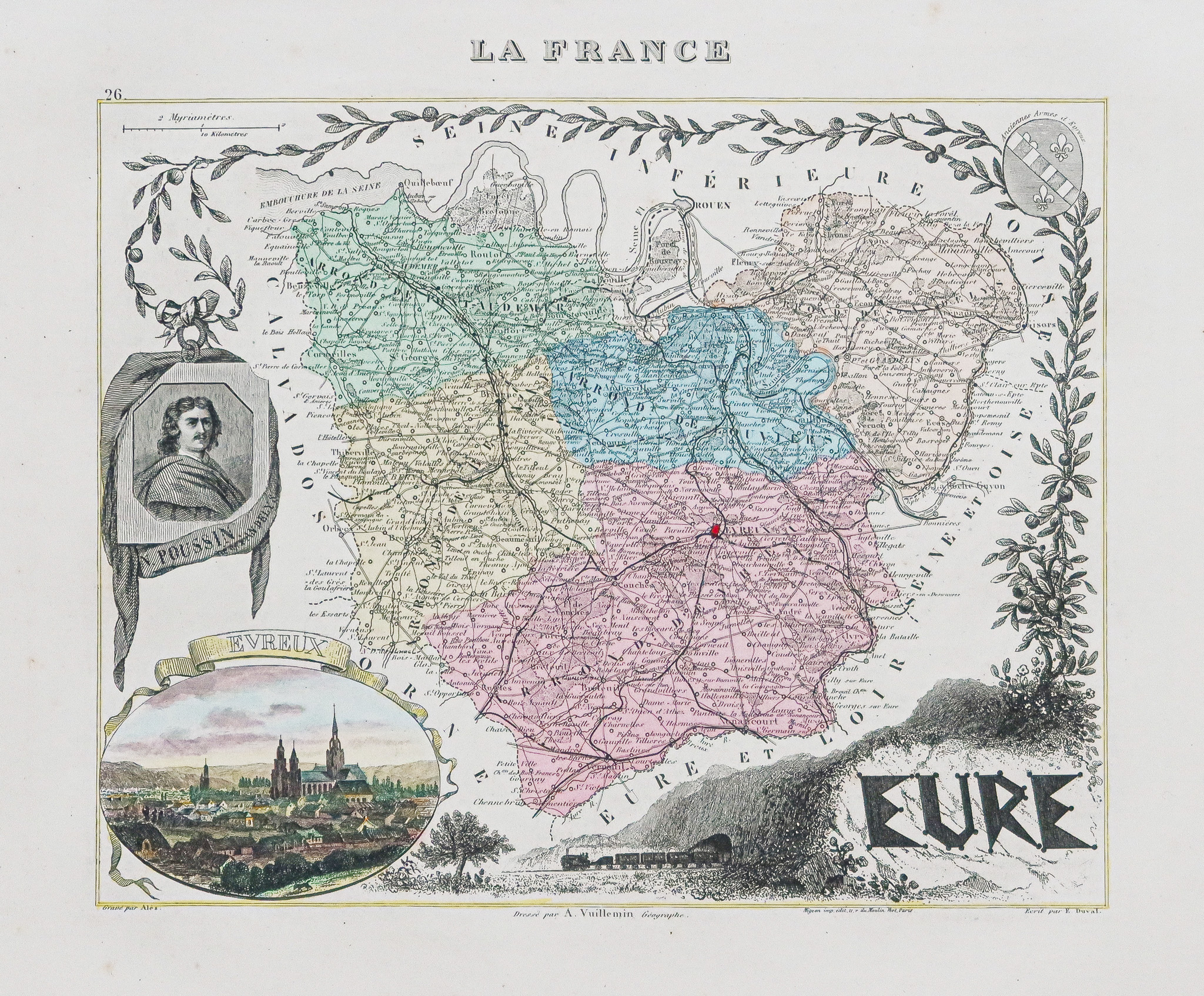 Edition de la fin du 19ème siècle, gravée par Alès, illustrant les départements français et d’Outre-mer, agrémentée de vignettes aquarellées du chef-lieu, curiosités et personnages célèbres.