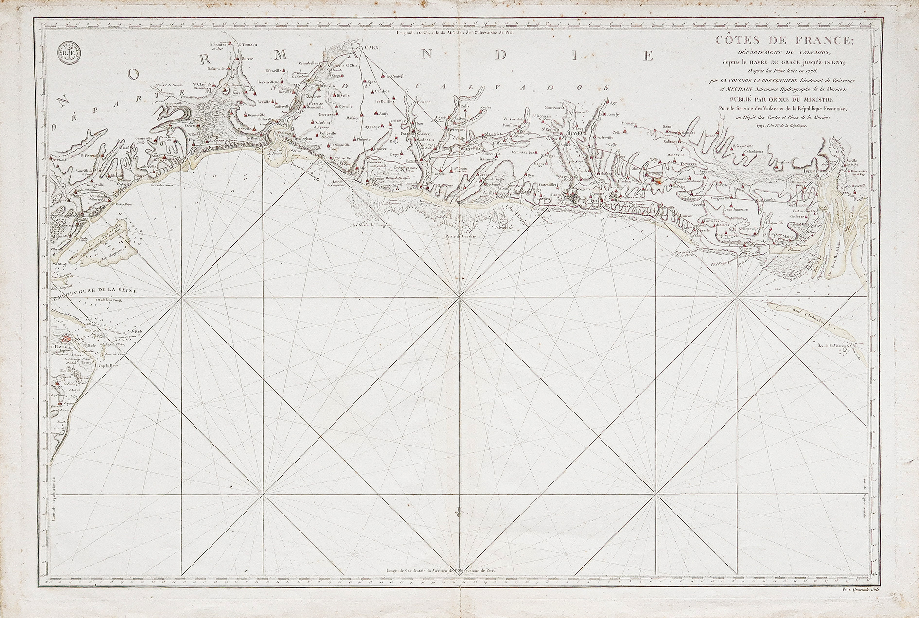 Echelle des lieux. Relevés maritimes des côtes normandes du Havre à Isigny levé en 1776 et publié pour des dépôts des cartes 1792.