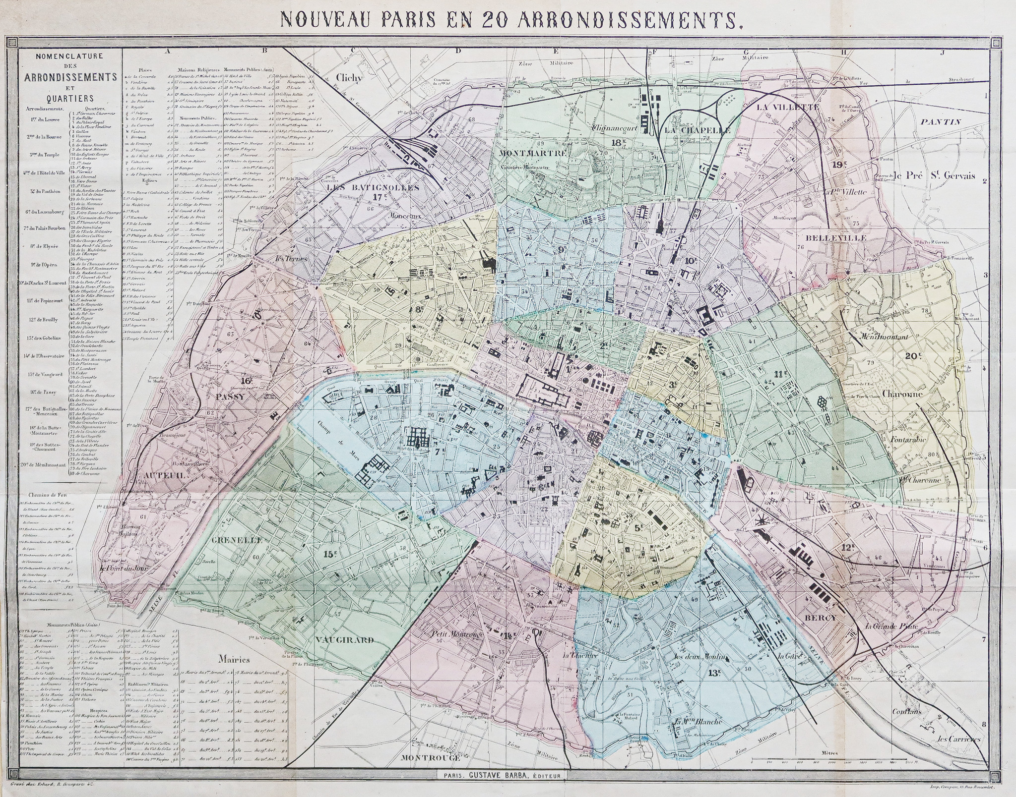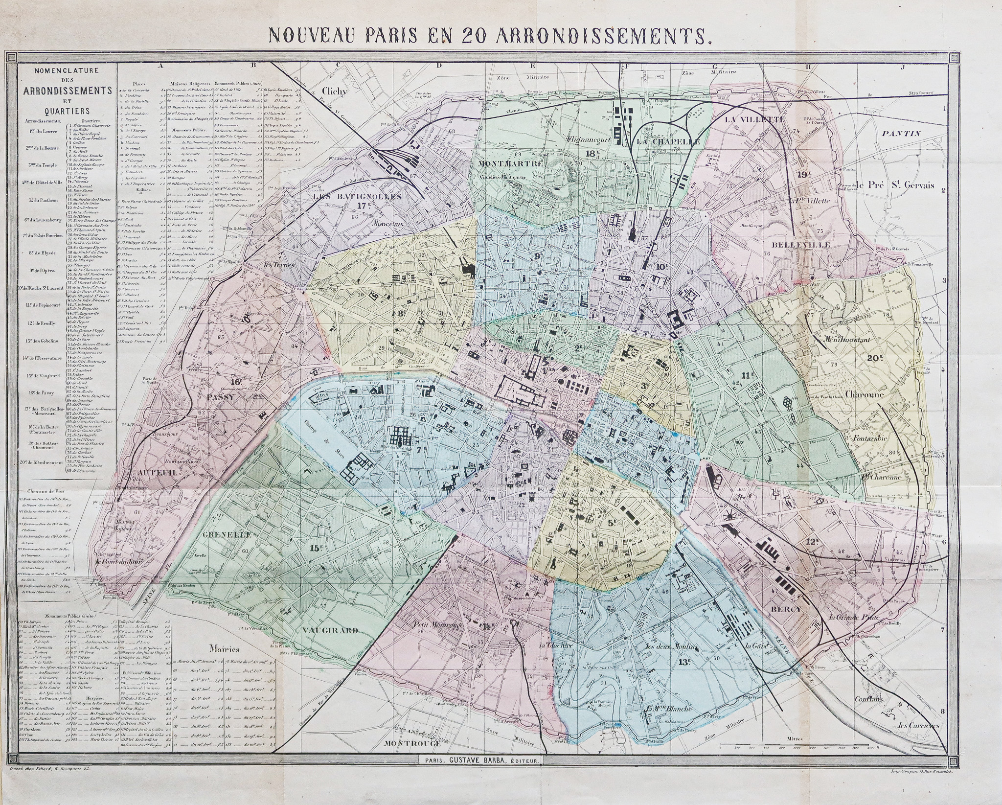 Nouveau plan en 20 arrondissements. Encart explicatif des quartiers, nomenclature des rues et monuments publics.
