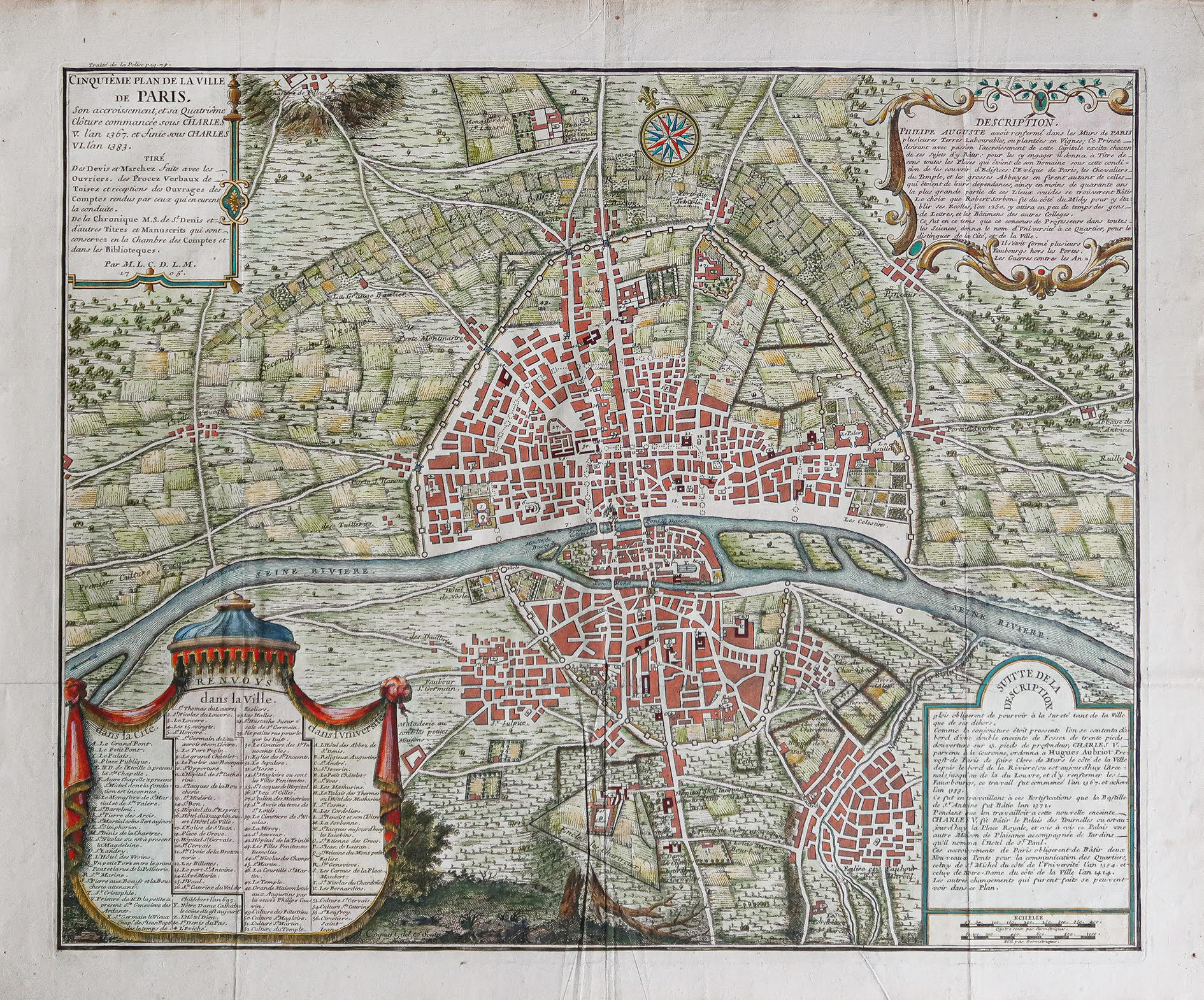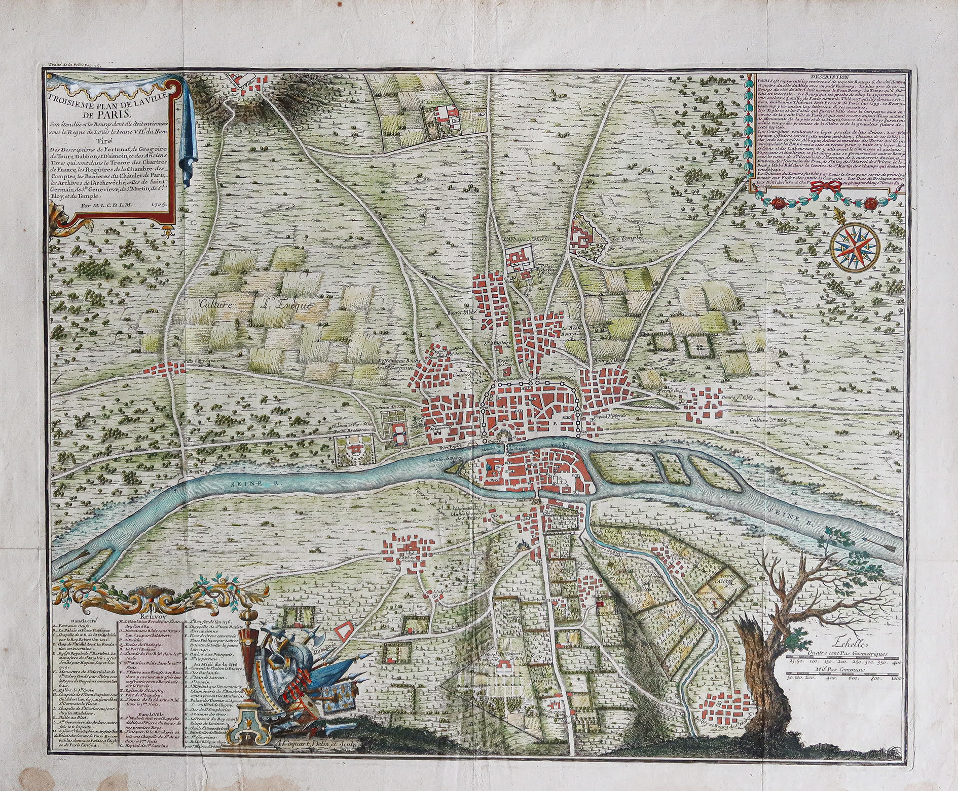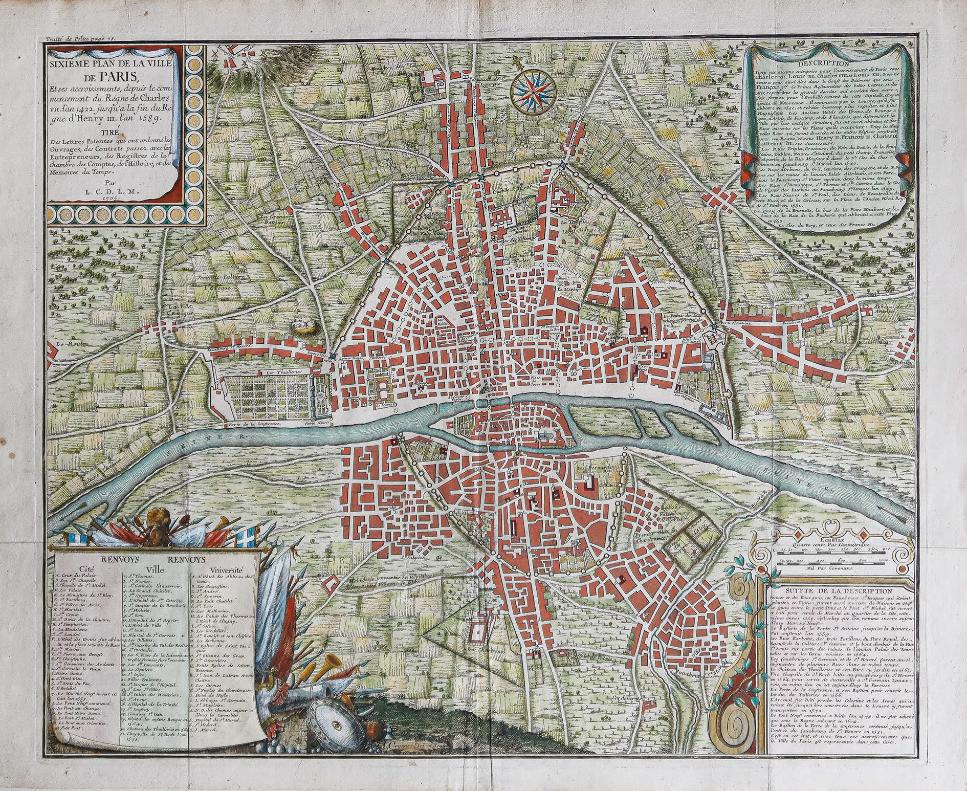 Chaque plan comporte d’élégants cartouches avec des titres, des légendes et des textes descriptifs. Ces plans constituent une compilation historique précieuse qui nous permet de retracer l’expansion et le développement de la ville depuis l’époque romaine jusqu’au début du 18ème siècle, en passant par la quatrième enceinte.