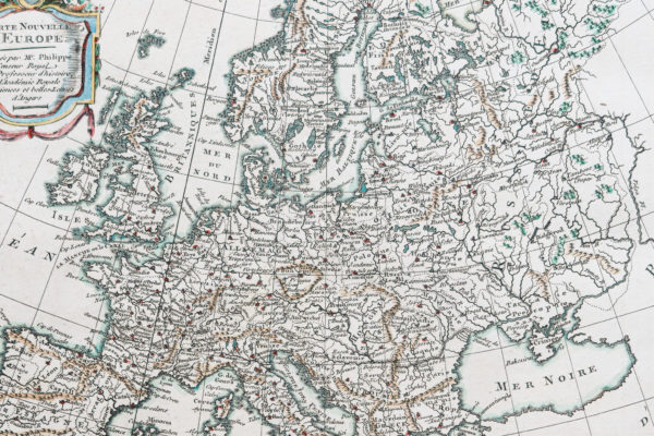 Epreuve originale réalisée en 1787. Philippe de Pretot auteur. Beaux coloris aquarelle. Rousseurs claires éparses. Bon état. Format feuille : 50,5 x 33,5 cm. Format gravure : 41,5 x 29 cm. Original antique map of 1787. Légende explicative des différentes migrations entre les peuples d’Europe.
