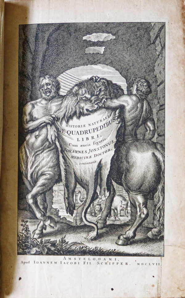 Historiae Naturalis de quadrupetibus Libri Cum aeneis figuris Johannes Jonstonus med: Doctor concinnauit Francofurti ad Moenum impensis Haeredum math : meriani. Cum Privilegio S Cef. M. et Regis Christianissimi Suivi de Historiae Naturalis de Avibus liber primus de Avibus terrestribus carnivoris de aquilis.